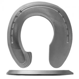 This is an asymmetric shoe with a wide branch to provide support under collateral or suspensory ligament injuries and a narrow branch to reduce pressure under subchondral bone lesions. (This is a medial left front shoe or a lateral right front shoe.) Please see the link below to choose A or B shoe. The view is from the ground side (not foot side) of the shoe.