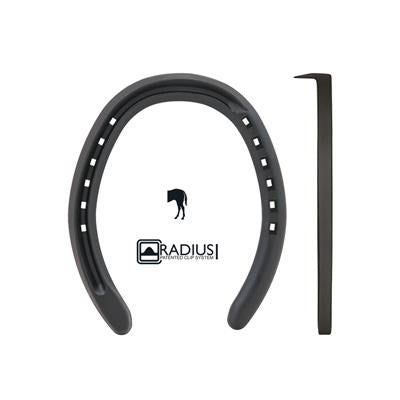 One of the most well-recognized shoes in Standardbred Racing. The half round-half swedge is the technical name for this shoe as the outer branch has the swedge (rim) and the inside branch is half round. This is most commonly used to help keep the path of the travel wider. It might also be used on the back of a Trotter that is speedy-cutting (interfering). It helps with pacers that crossfire (right hand hitting the left front and visa versa). The support in the heel area, with a slightly wider lateral heel, increases the horse's chances of remaining sound.